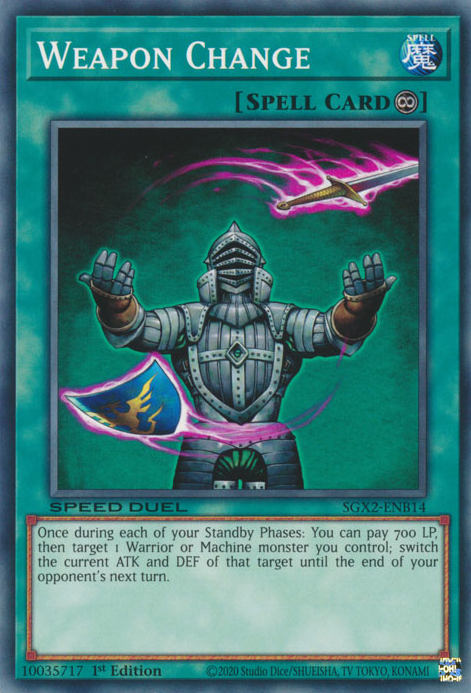 Once during each of your Standby Phases, you can pay 700 Life Points to activate this card''s effect. Switch the ATK and DEF of 1 Warrior-Type or Machine-Type monster on your side of the field until the end of your opponent''s next turn. When this card is destroyed, the effect is negated.