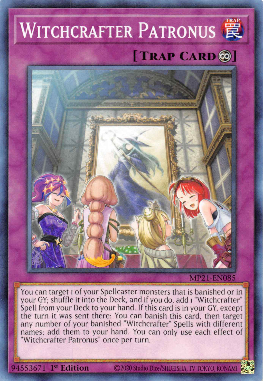You can target 1 of your Spellcaster monsters that is banished or in your GY; shuffle it into the Deck, and if you do, add 1 "Witchcrafter" Spell from your Deck to your hand. If this card is in your GY, except the turn it was sent there: You can banish this card, then target any number of your banished "Witchcrafter" Spells with different names; add them to your hand. You can only use each effect of "Witchcrafter Patronus" once per turn.