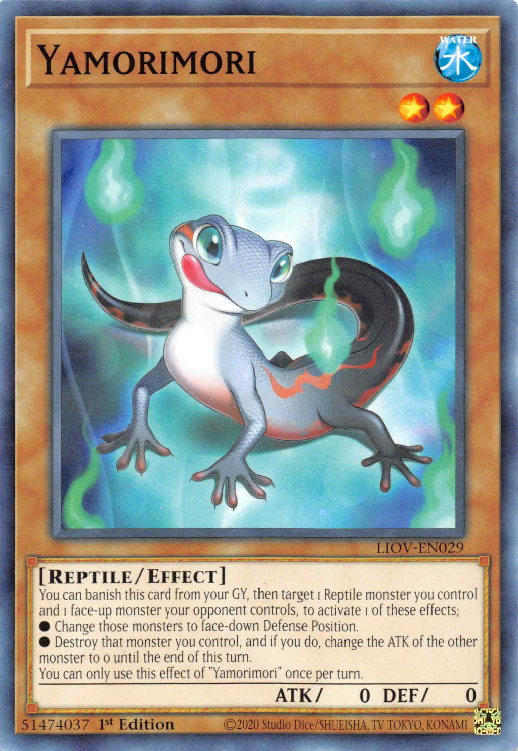 You can banish this card from your GY, then target 1 Reptile monster you control and 1 face-up monster your opponent controls, to activate 1 of these effects; • Change those monsters to face-down Defense Position. • Destroy that monster you control, and if you do, change the ATK of the other monster to 0 until the end of this turn. You can only use this effect of "Yamorimori" once per turn.