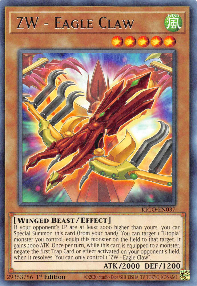 If your opponent's LP are at least 2000 higher than yours, you can Special Summon this card (from your hand). You can target 1 "Utopia" monster you control; equip this monster on the field to that target. It gains 2000 ATK. Once per turn, while this card is equipped to a monster, negate the first Trap Card or effect activated on your opponent's field, when it resolves. You can only control 1 "ZW - Eagle Claw".