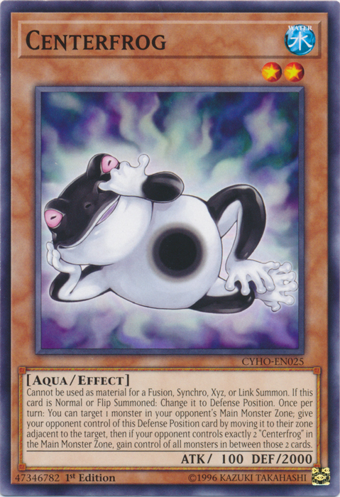 Cannot be used as material for a Fusion, Synchro, Xyz, or Link Summon. If this card is Normal or Flip Summoned: Change it to Defense Position. Once per turn: You can target 1 monster in your opponent's Main Monster Zone; give your opponent control of this Defense Position card by moving it to their zone adjacent to the target, then if your opponent controls exactly 2 “Centerfrog” in the Main Monster Zone, gain control of all monsters in between those 2 cards.
